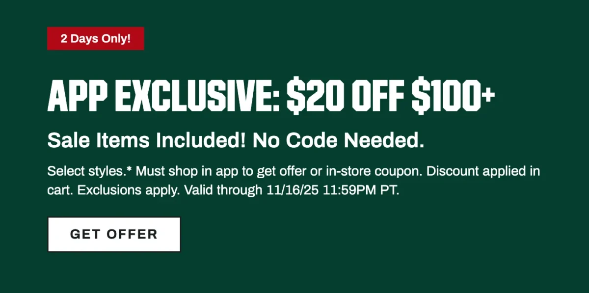 Gear up for the holidays and save big with this DICK’S Sporting Goods app-exclusive deal! For a limited time, get $20 off your purchase of $100 or more, including sale items — no promo code needed. Just shop through the DICK’S mobile app or use your in-store coupon before November 16, 2025, at 11:59 PM PT.