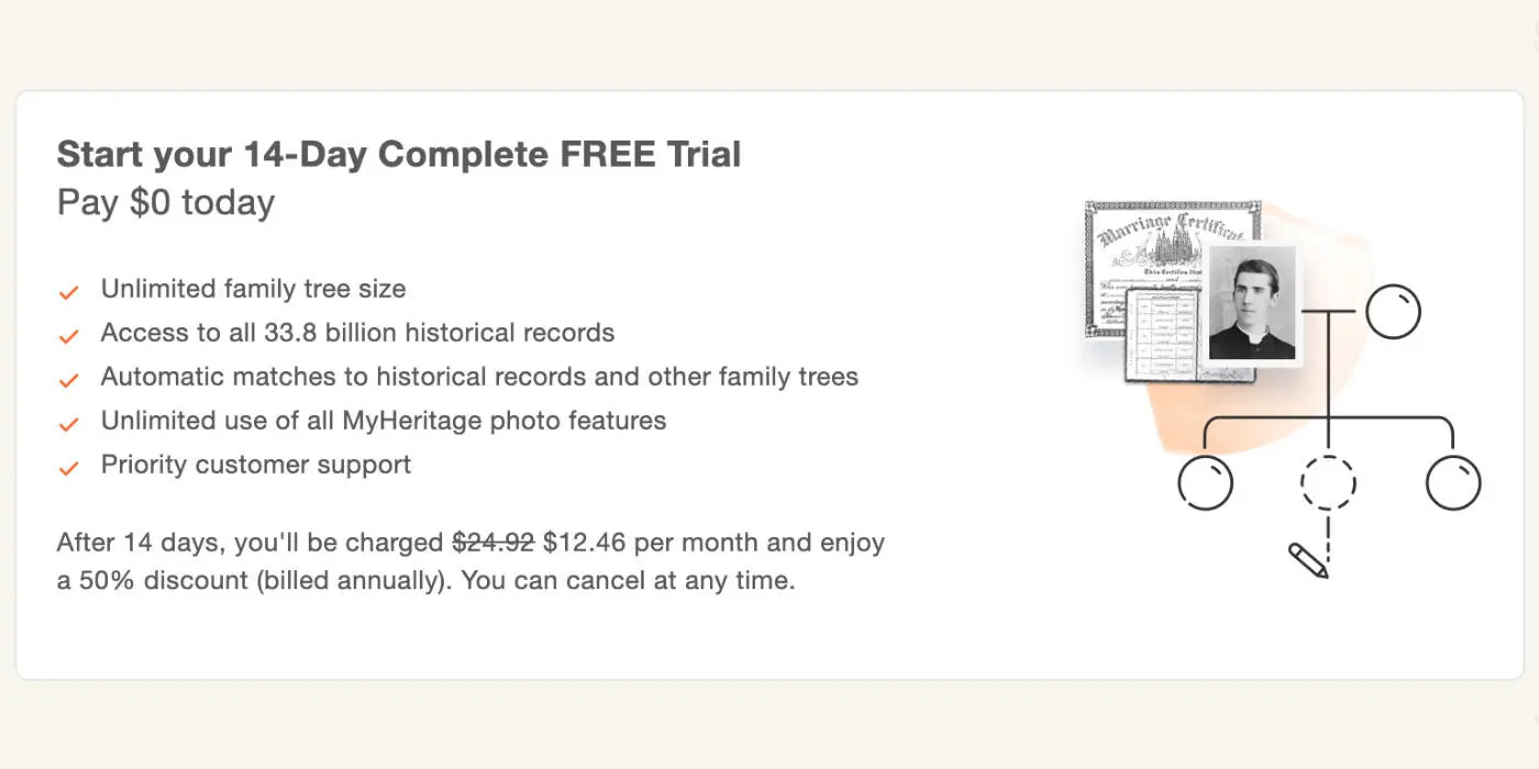 Take advantage of this free 14-day trial to trace your family tree and discover your ancestors. Sign up with MyHeritage and explore your roots at 50% off if you continue!
