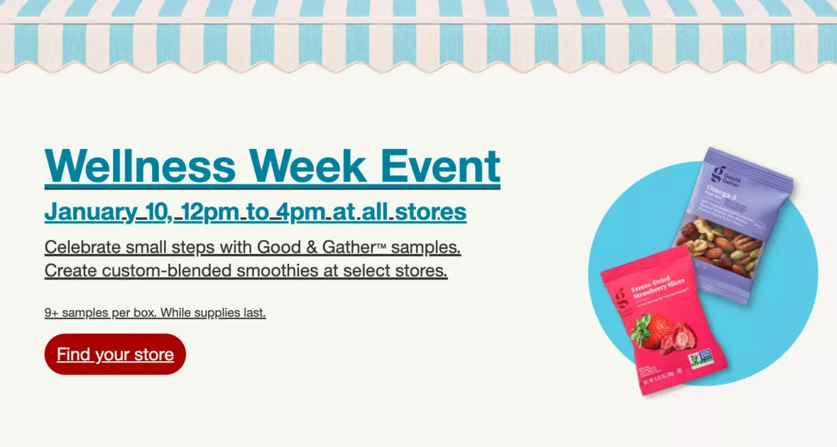 Target is hosting exciting in-store events that are perfect for anyone looking to kickstart their health goals this year. You can head to your local store on January 10th for the FREE Wellness Week Event to snag some delicious samples. They are offering select Good & Gather products completely free of charge. Some lucky shoppers will even find custom-blended smoothies at select locations. It is a fun way to shop and save at the same time so mark your calendar now.