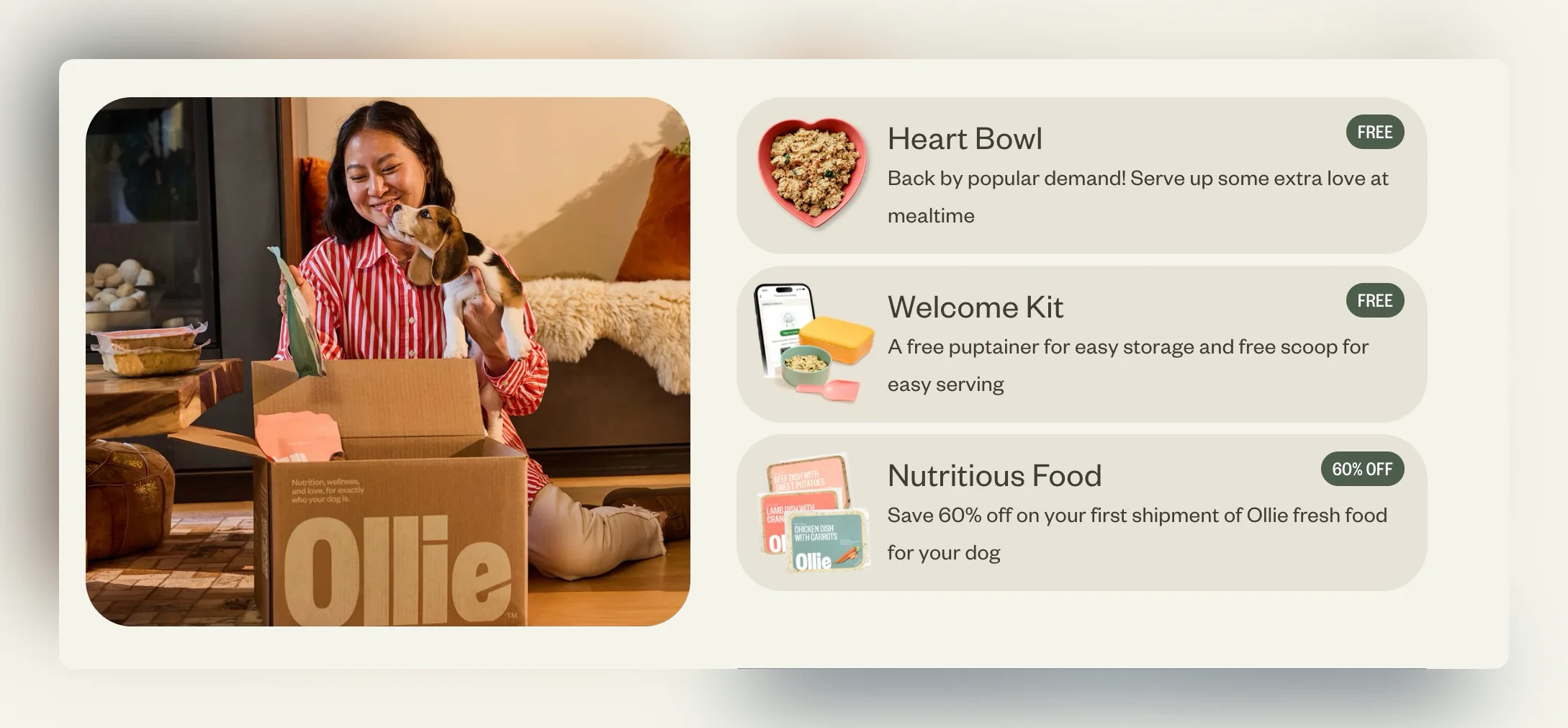 You can find the offer directly on the Ollie dog food deal with free heart bowl.