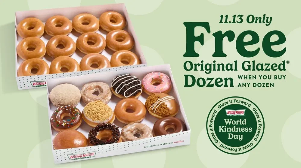 Krispy Kreme is celebrating World Kindness Day this Thursday, Nov. 13, with a sweet offer to share joy. Get a Free Original Glazed dozen when you purchase any regular-priced dozen. This limited-time Krispy Kreme free doughnut deal is perfect for spreading cheer. It’s a thoughtful way to treat family, friends, or even co-workers. Don’t miss out on this delicious opportunity to make someone smile while supplies last.
