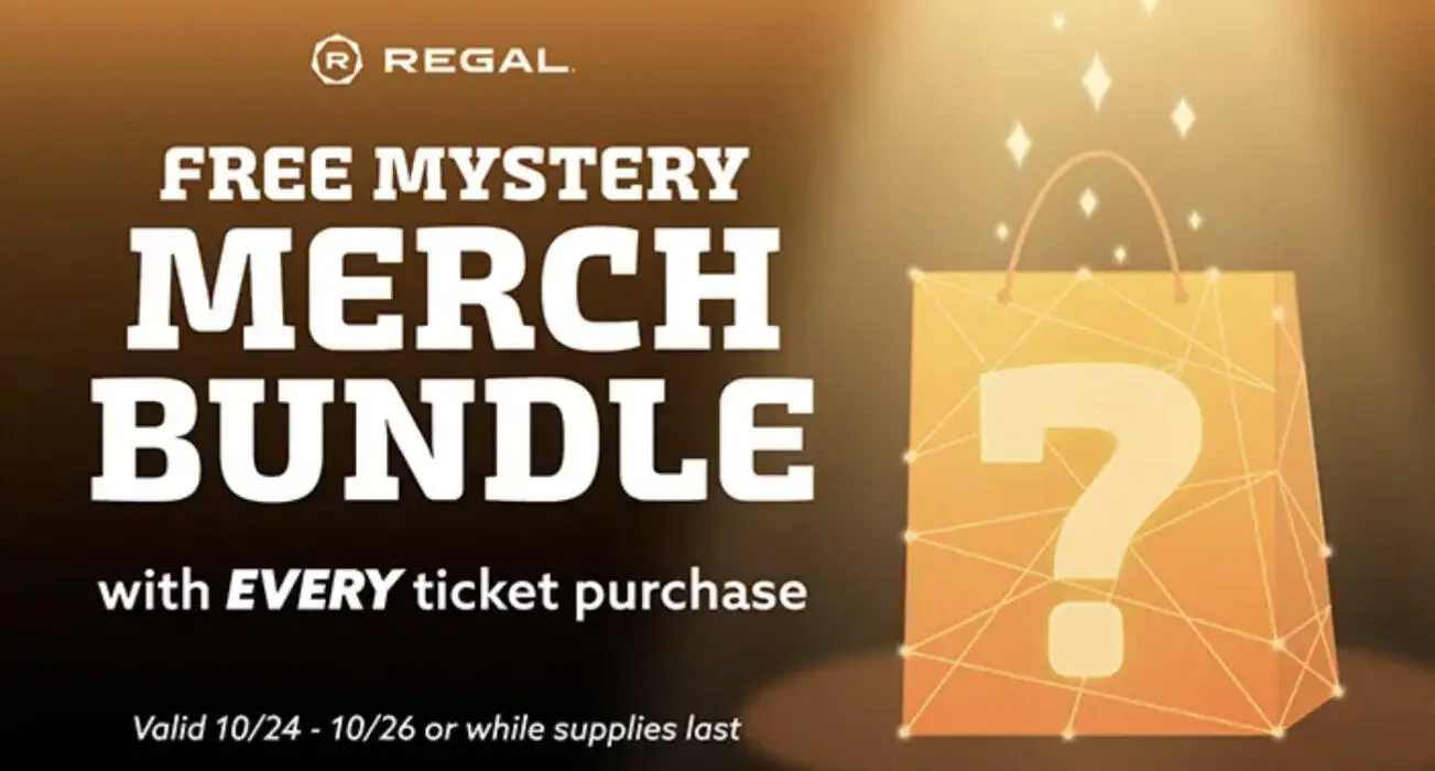 Starting October 24, every movie ticket purchase at participating Regal theatres includes a FREE Mystery Merch Bundle. It’s the perfect bonus for movie lovers — get a surprise gift just for catching a film on the big screen.
