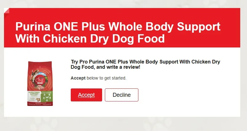 You can find the offer directly here for Purina ONE Plus Whole Body Support Dry Dog Food or Dry Cat Food.