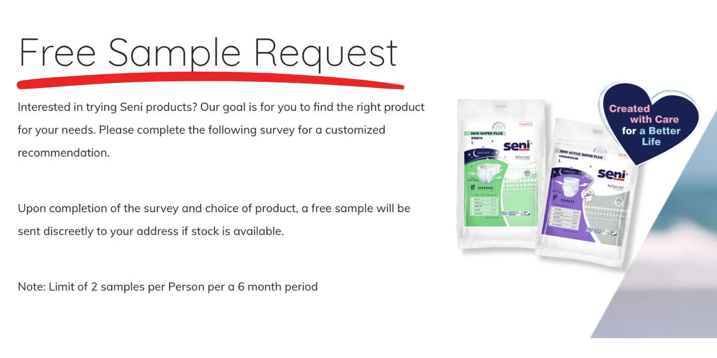 If you or a loved one needs incontinence products, Seni is offering a FREE sample of their premium underwear or briefs! Seni products are known for their comfort, high absorbency, and skin-friendly materials. This is a great opportunity to try them out for free and find the perfect fit without any cost.